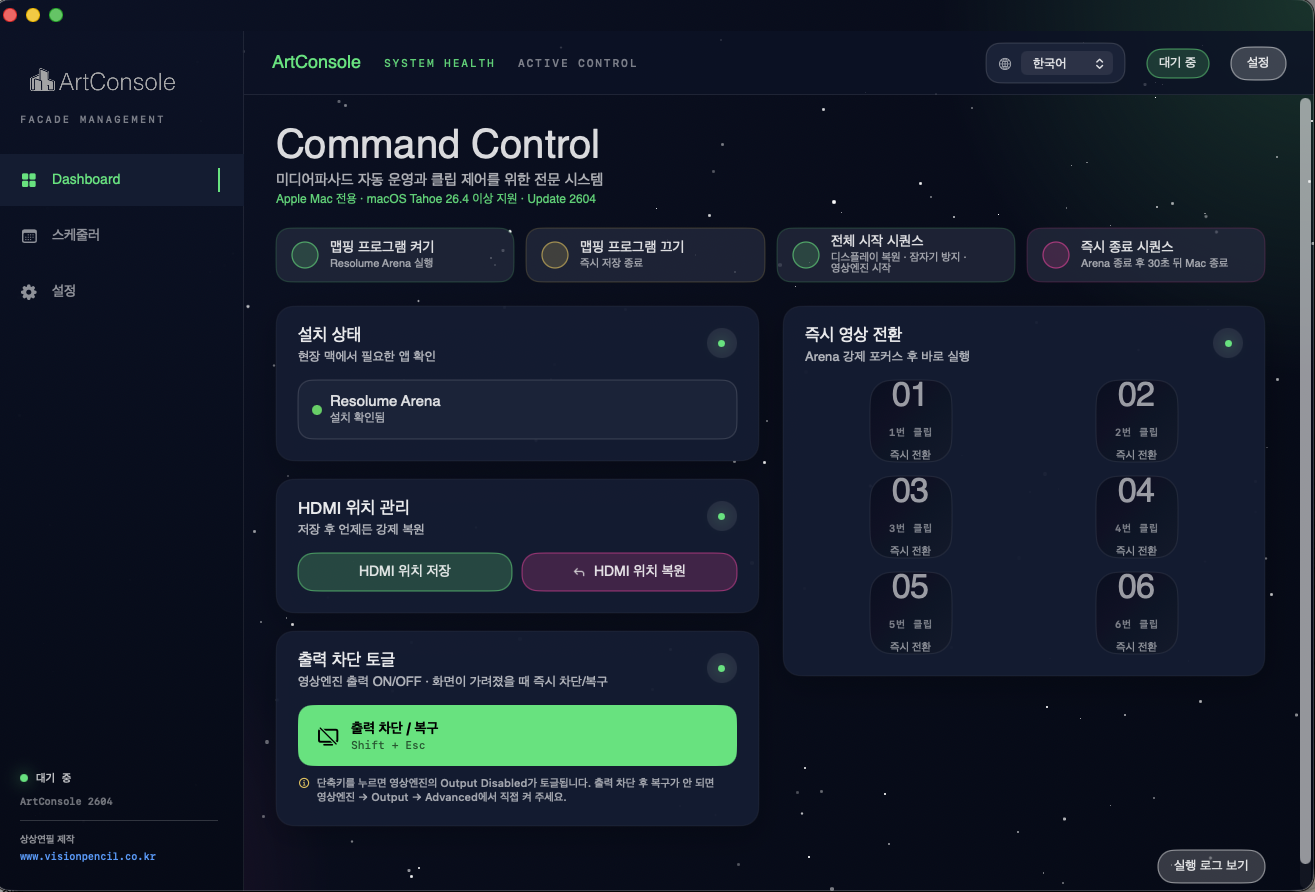 상상연필 ArtConsole은 미디어파사드(Media Facade) 운영을 자동화하는 macOS 전용 데스크톱 앱입니다. Resolume Arena와 연동하여 영상 클립 재생, 예약 스케줄, 시작/종료 시퀀스를 자동으로 처리합니다.