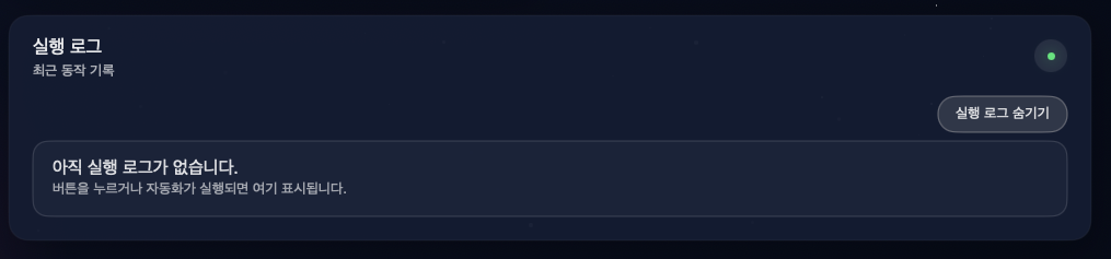 ▲ 실행 로그 — 모든 자동화 동작이 타임스탬프와 함께 기록됩니다