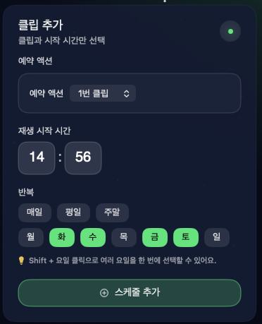 Shift + 요일로 여러 요일 동시 선택 가능합니다. - 4스케줄 추가+ 스케줄 추가 버튼을 누르면 라이브 타임라인에 추가됩니다.