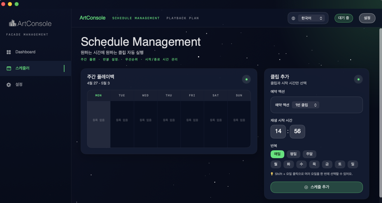 Mac에서 미디어파사드의 시작부터 종료까지, 예약 재생과 원격 제어를 하나의 앱으로 통합 관리합니다.